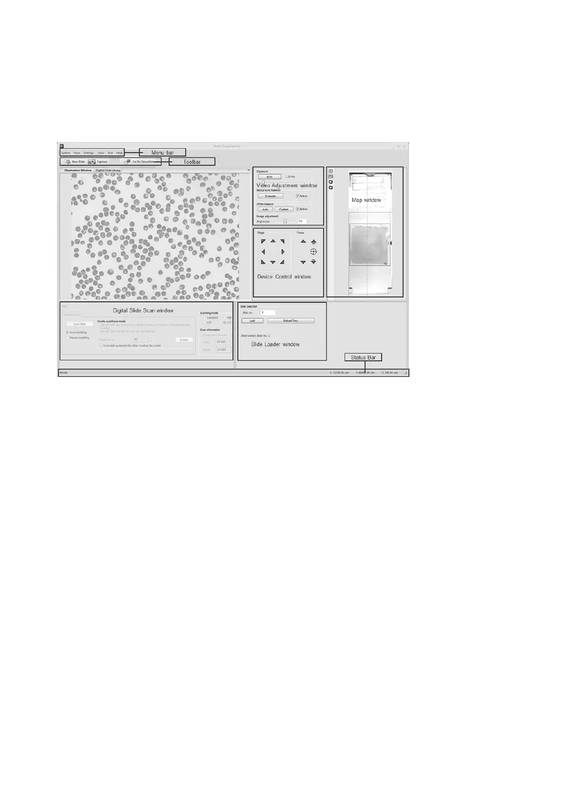 The advanced mode interface consists of a title bar, menu bar, tool bar, observation window, status bar,