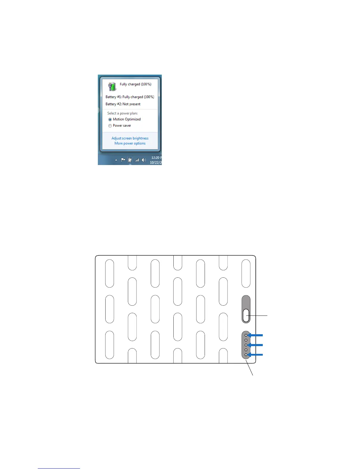 • Locate the battery gauge button and the battery power indicator lights and press the