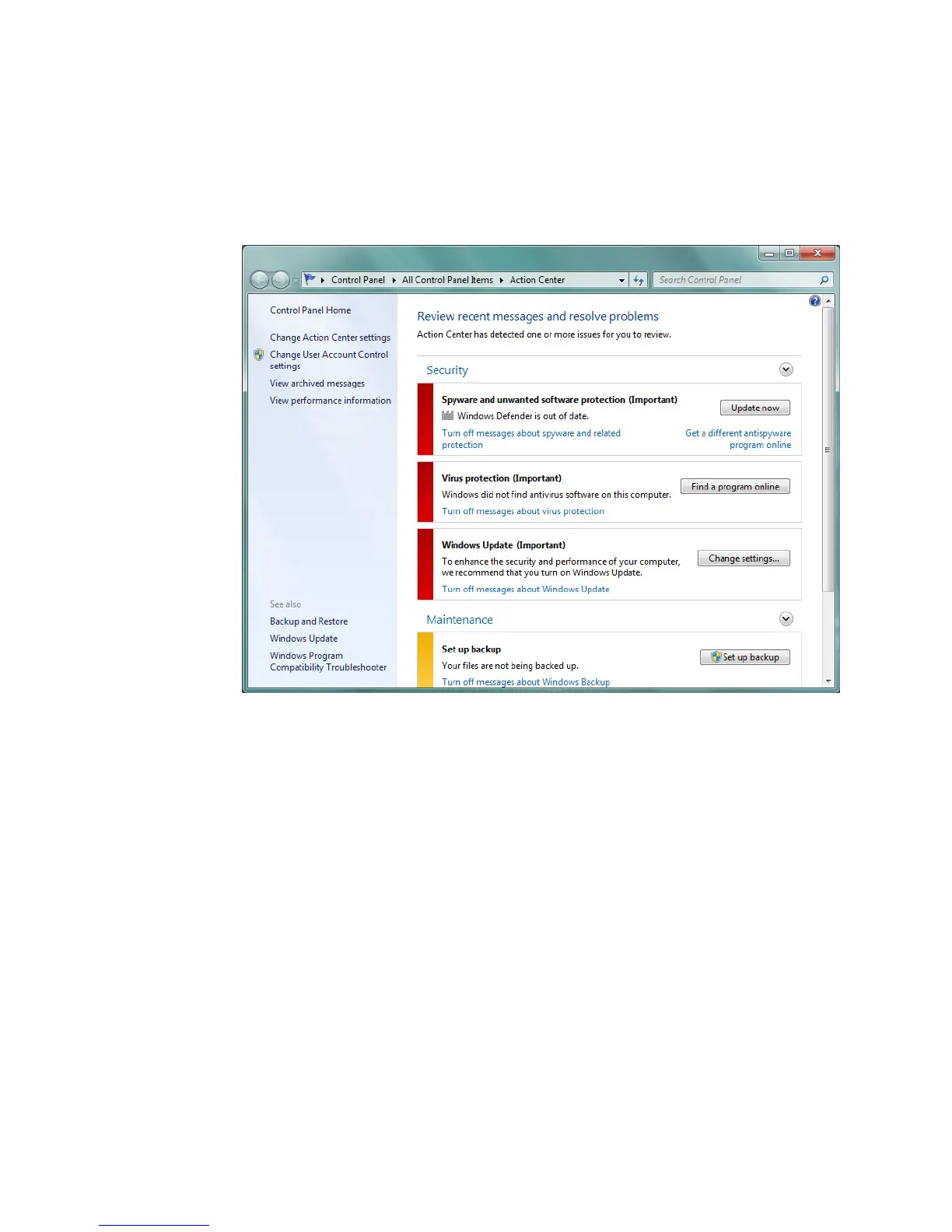 an out-of-date antivirus application), the Security Center sends you an alert and provides