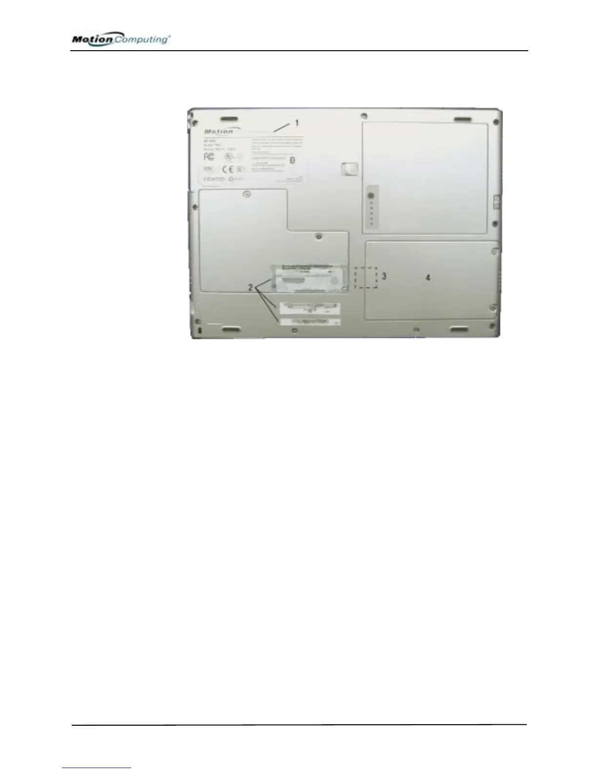 Motion Tablet PC Label Locations: (1) System Label; (2) Product Identification; (3) Internal Modem with