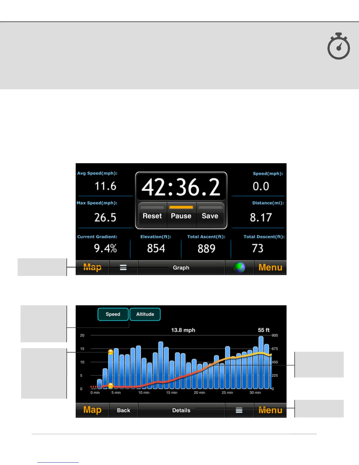 and altitude graphs with optional overlay.