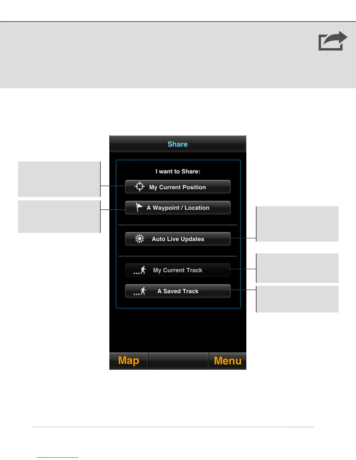 Select the Share button from the main menu to share your tracks, waypoints, or