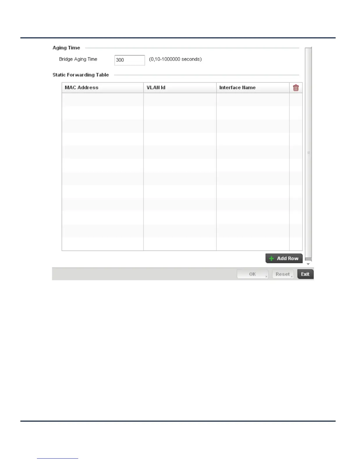 6. Define or override a Bridge Aging Time between 0, 10-1,000,000 seconds.