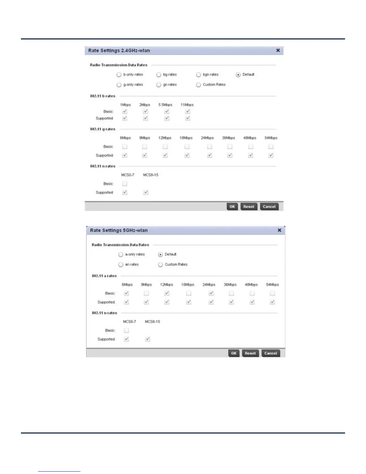 and 802.11n rates supported by the 2.4 GHz band and 802.11a and 802.11n rates supported by the 5.0