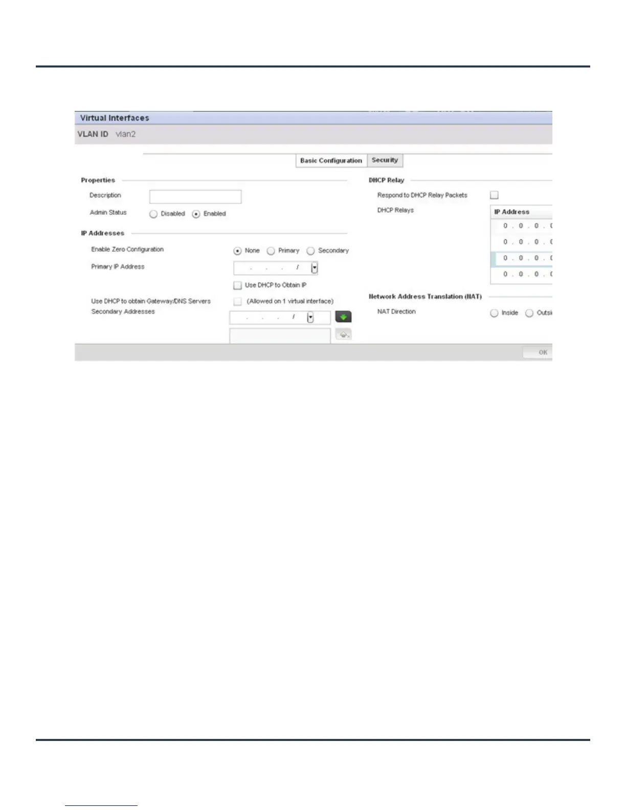 The Basic Configuration screen displays by default regardless of a whether a new Virtual Interface is