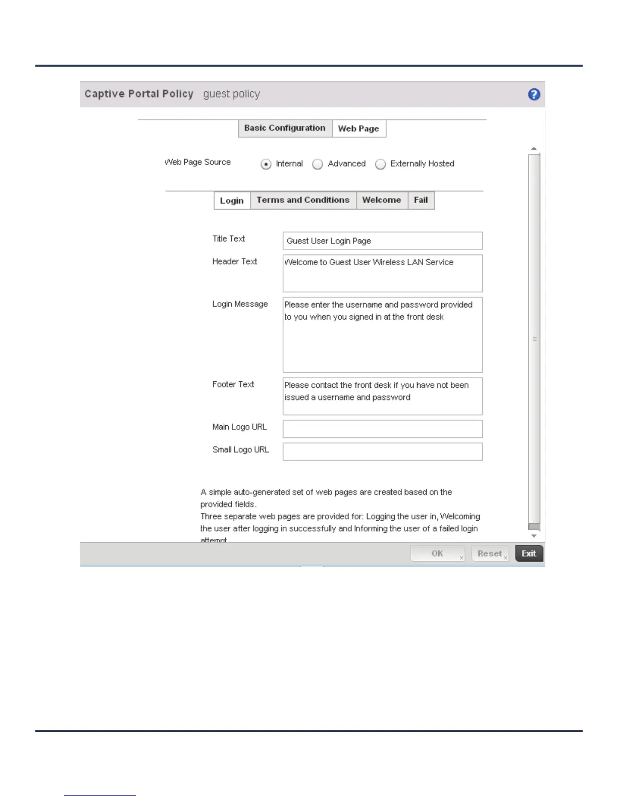 Figure 9-4 Captive Portal Policy Basic Web Page screen