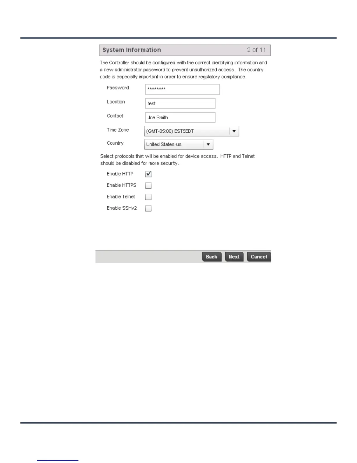 9. Select any or all of access methods (HTTP, HTTPS, Telnet or SSHv2) used for connecting to this AP-6511
