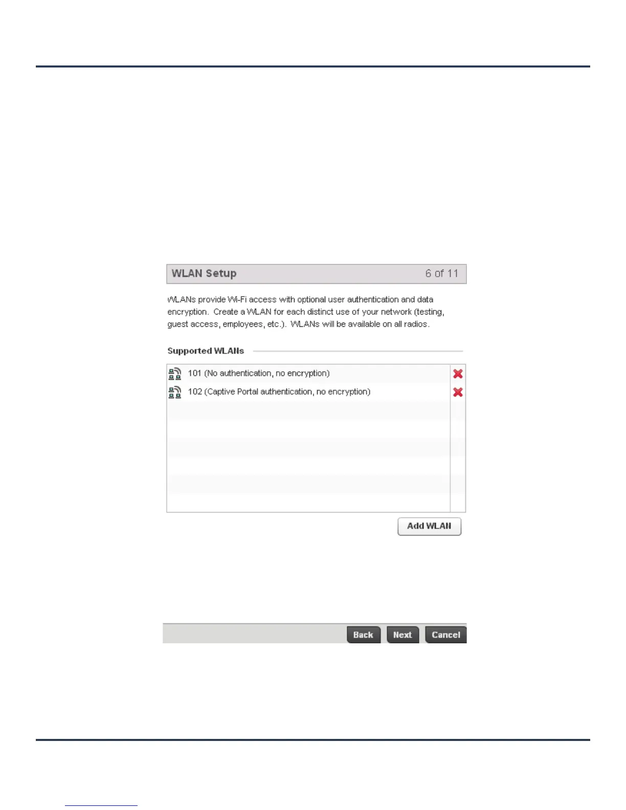 16. The WLAN Setup screen allows you to define which WLANs are initially enabled on the AP-6511.