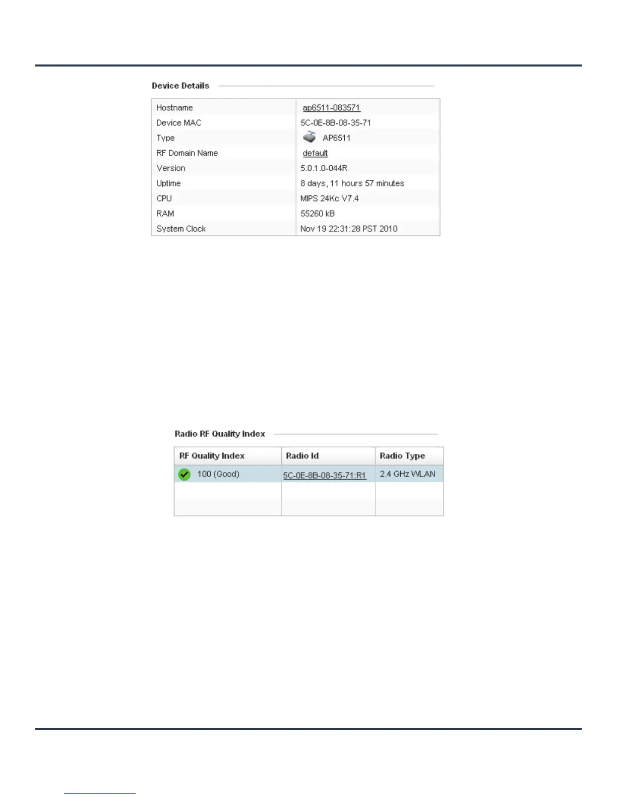 RF Quality displays as the average quality index for the single RF Domain utilized by the AP-6511. The table