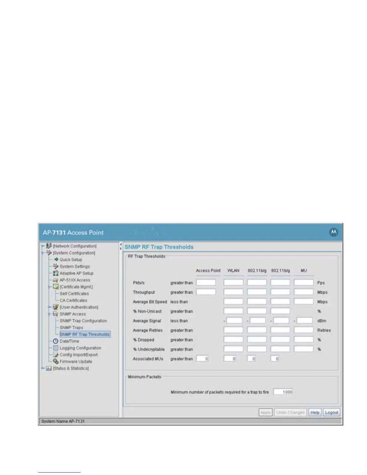 Use the SNMP RF Trap Threshold screen as a means to track RF activity and the access point’s