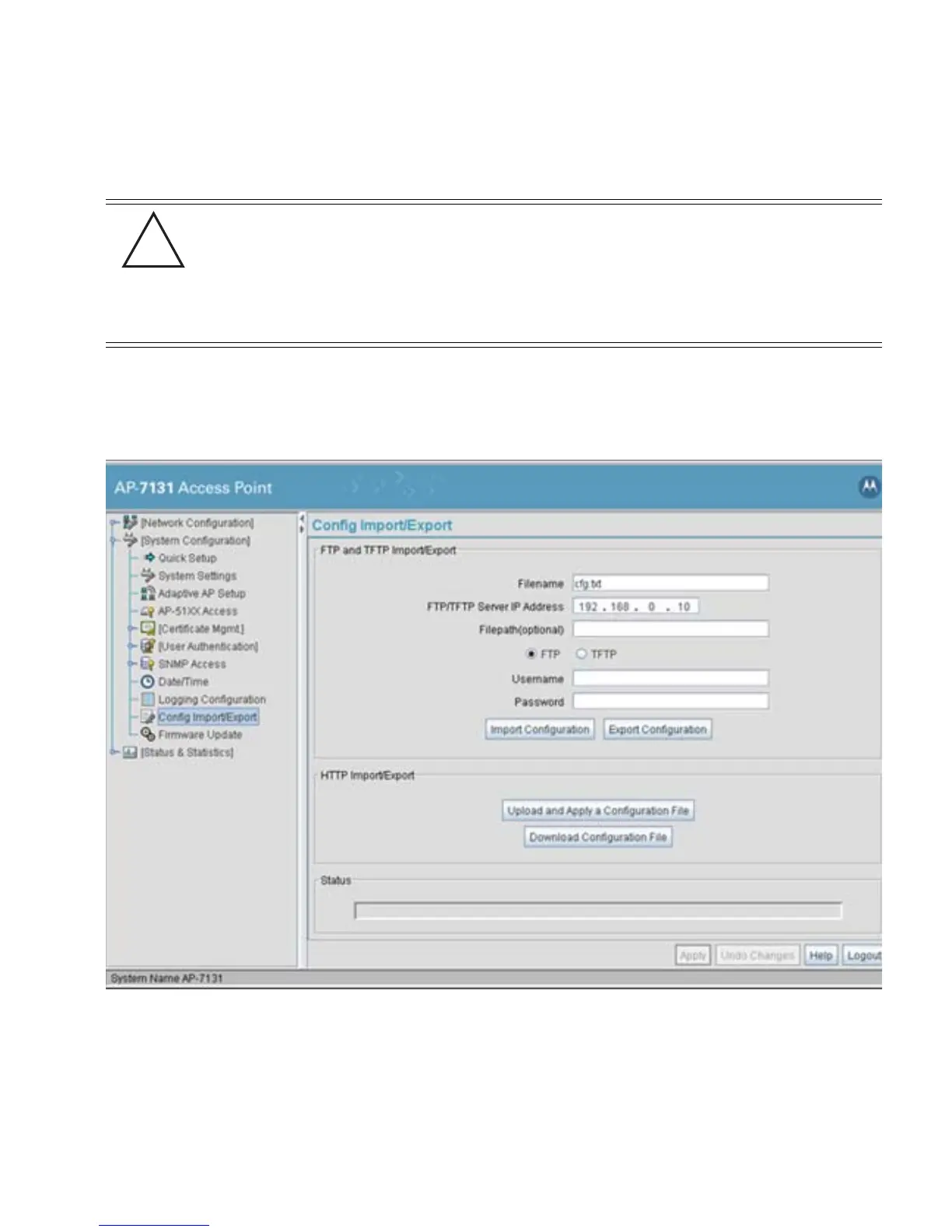 1. Select System Configuration - > Config Import/Export from the access point menu tree.