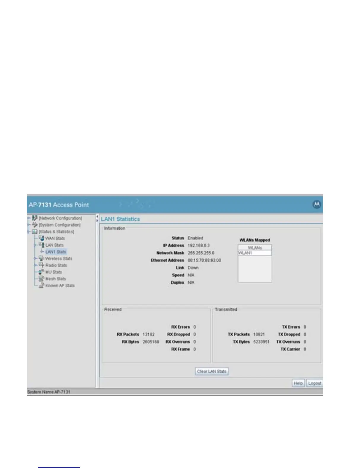 LAN2 port since it was last enabled or the access point was last restarted. The LAN Stats screen is