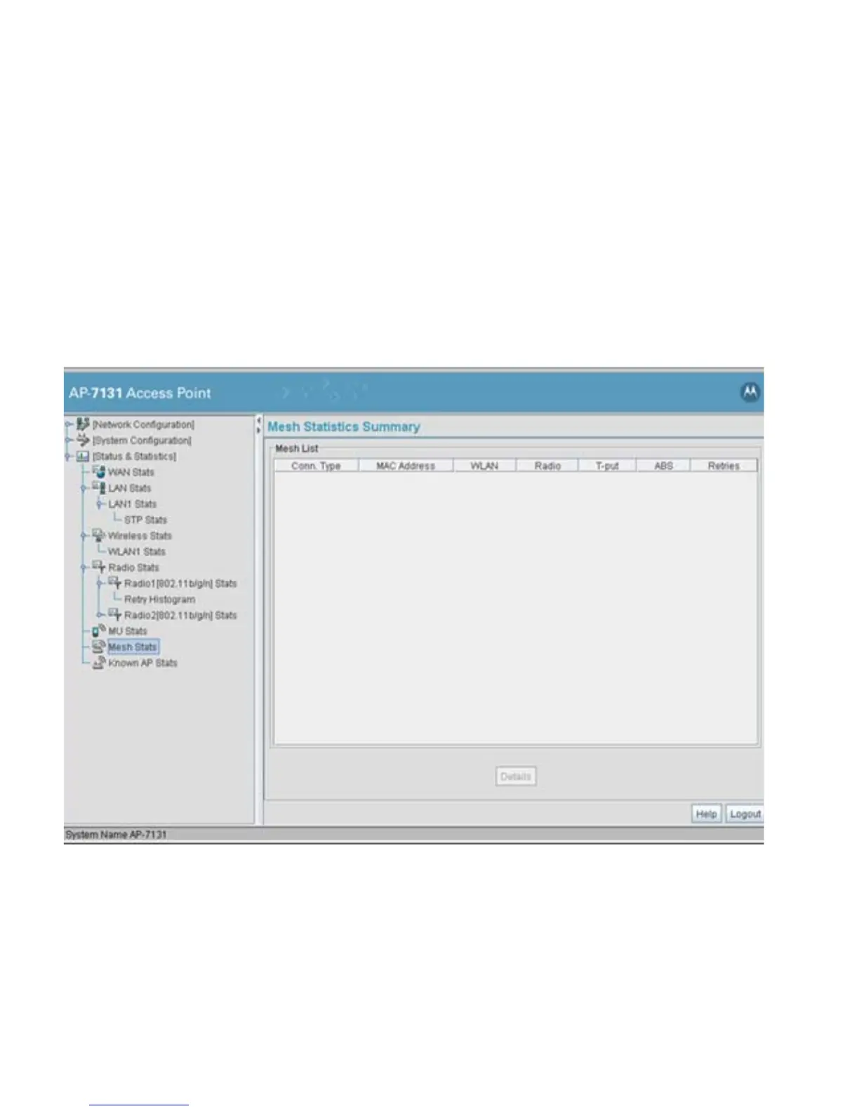 1. Select Status and Statistics -> Mesh Stats from the access point menu tree.
