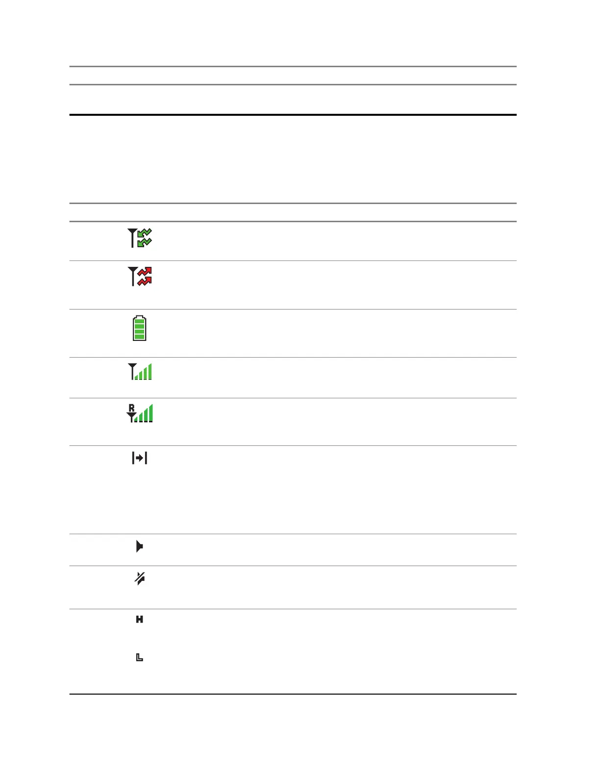 menu entries. The top two display rows contain color icons that indicate radio operating conditions.