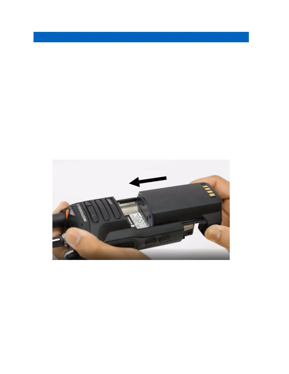 • To attach the battery, align the battery with the bottom rails on the back of the radio. Slide the