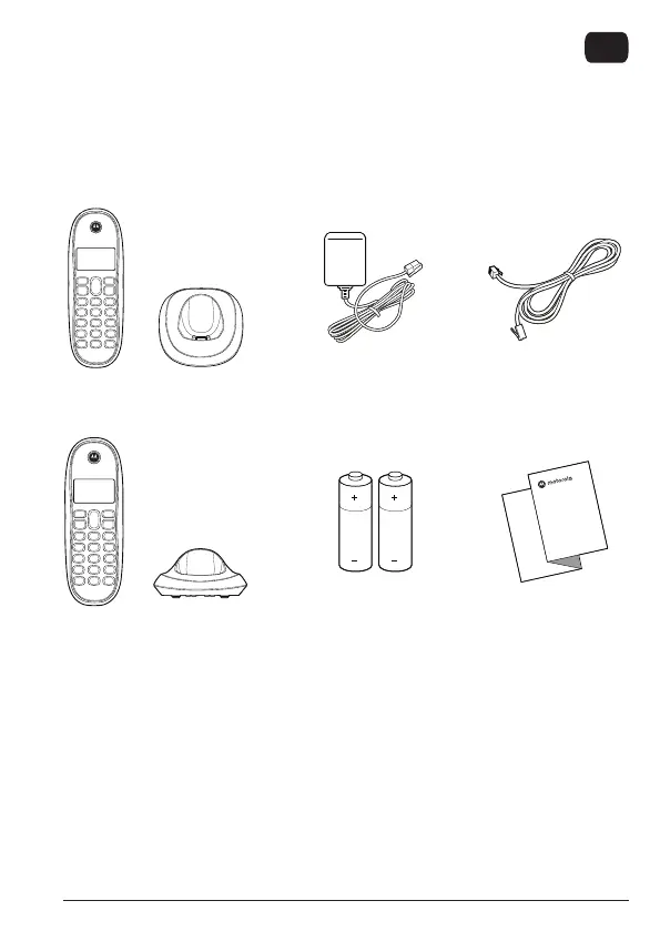 Cordless handset and base Power adaptor Telephone line cord