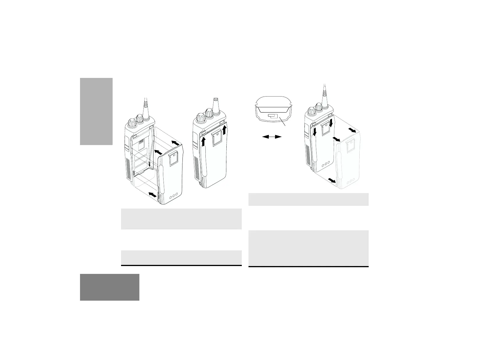 2 Press the battery firmly to the radio and slide