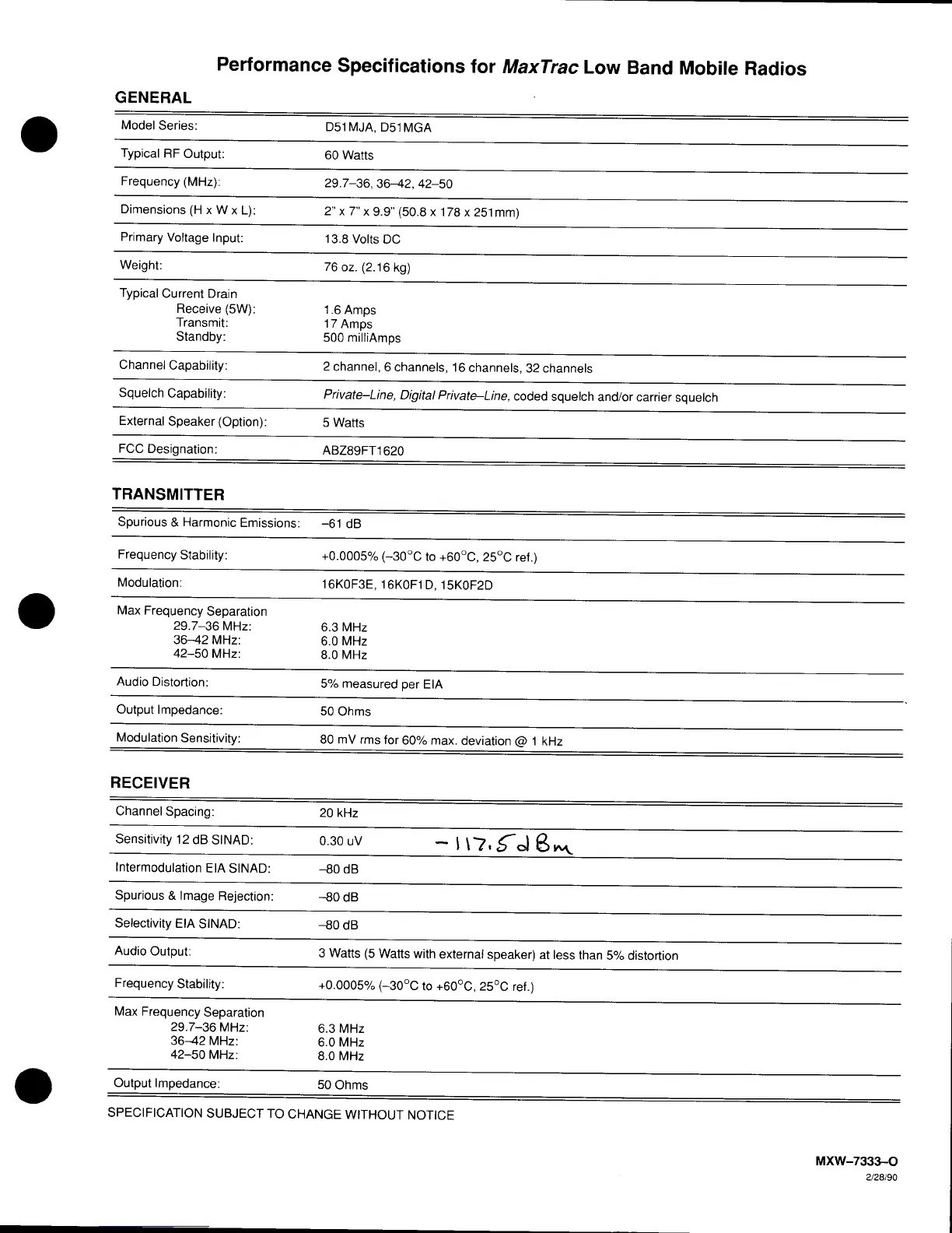 Motorola MaxTrac - Performance Specifications for MaxTrac Low Band Mobile Radios