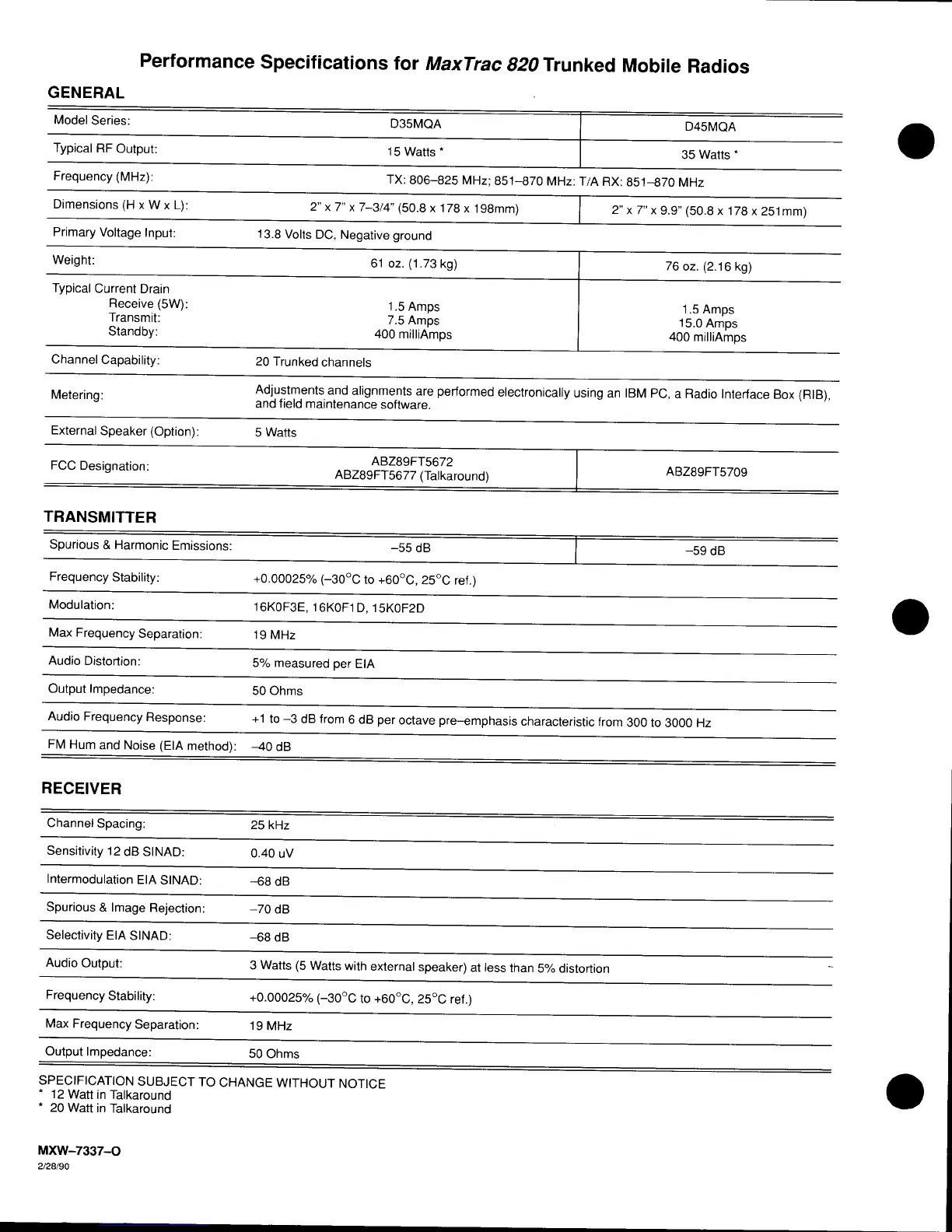 Motorola MaxTrac - Performance Specifications for MaxTrac 820 Trunked Mobile Radios