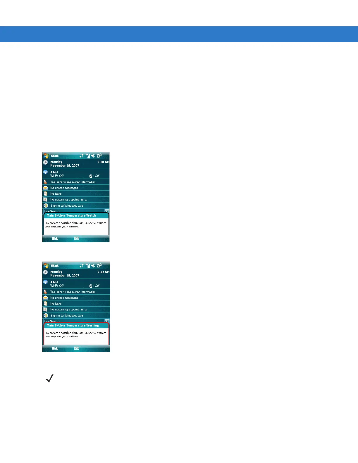 NOTE The Temperature Warning dialog box remains visible until you tap Hide.