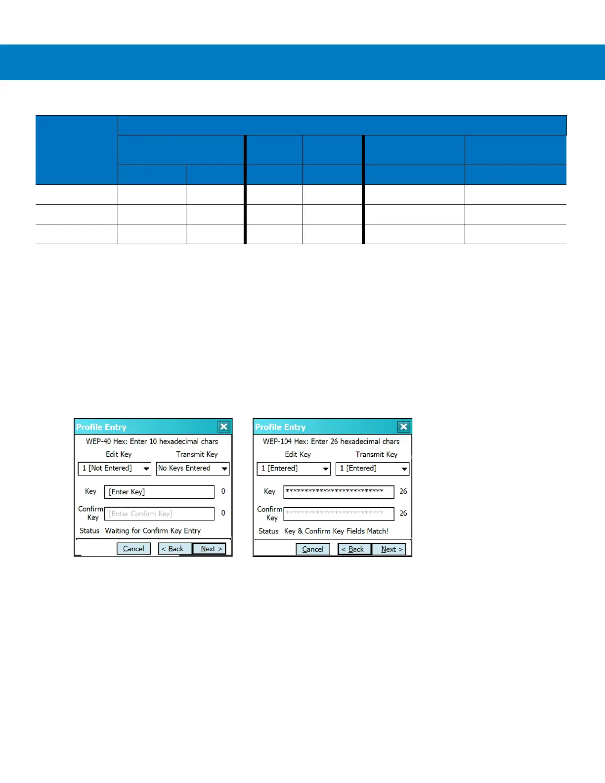 If either WEP-40 (40/24) or WEP-104 (104/24) is selected, the wizard displays the key entry dialog unless the Use