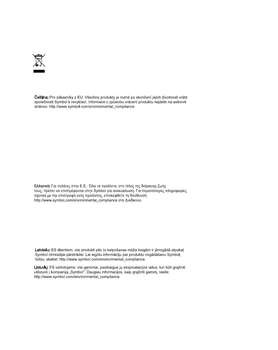 Dansk: Til kunder i EU: Alle produkter skal returneres til Symbol til recirkulering, når de er