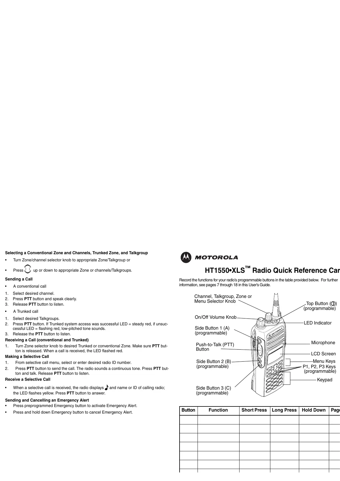 Record the functions for your radio’s programmable buttons in the table provided below. For further