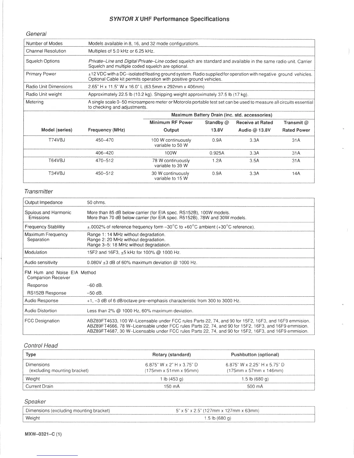 Motorola SYNTOR X - SYNTOR X UHF Performance Specifications; General Performance Specifications; Transmitter Performance; Control Head and Speaker Specs
