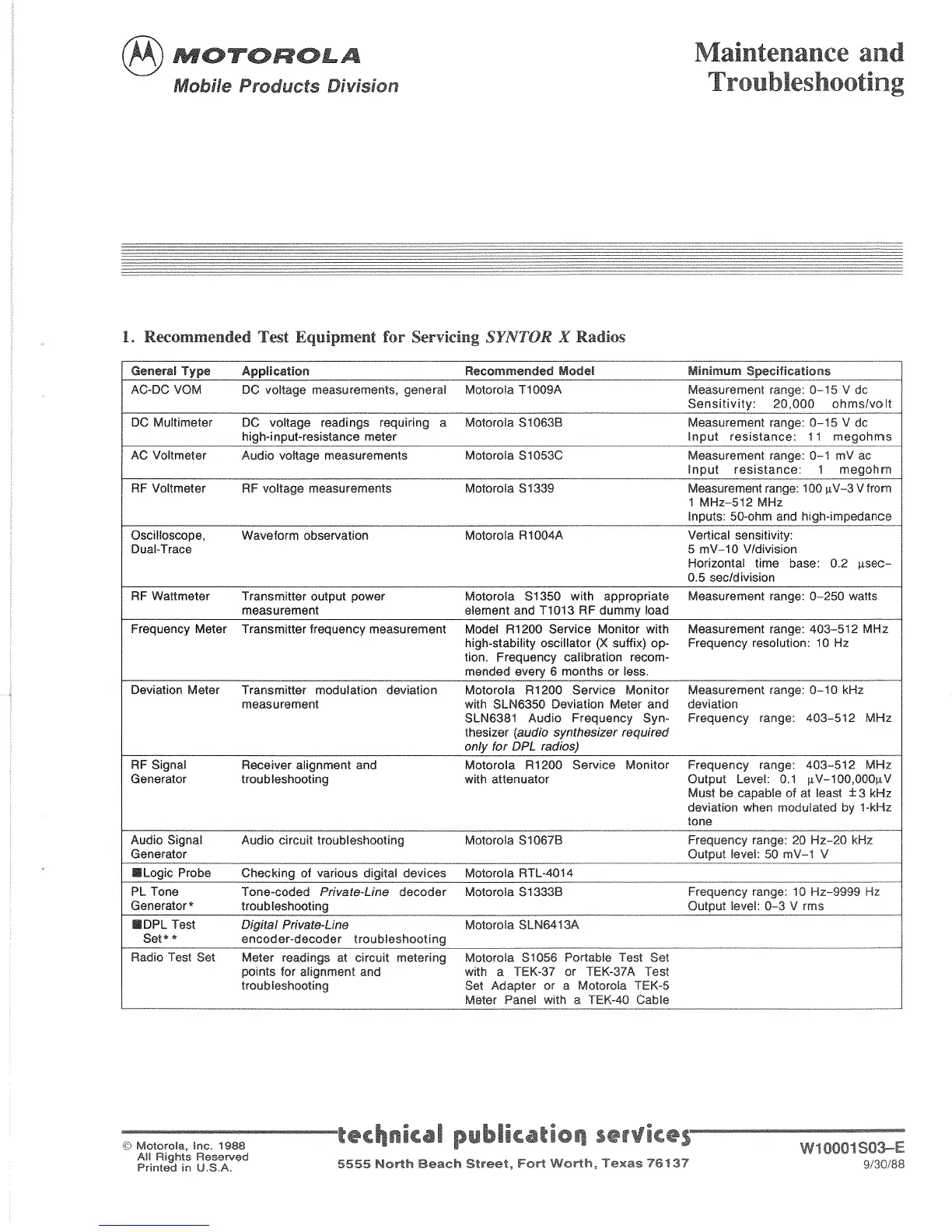 Motorola SYNTOR X - Maintenance and Troubleshooting; Recommended Test Equipment