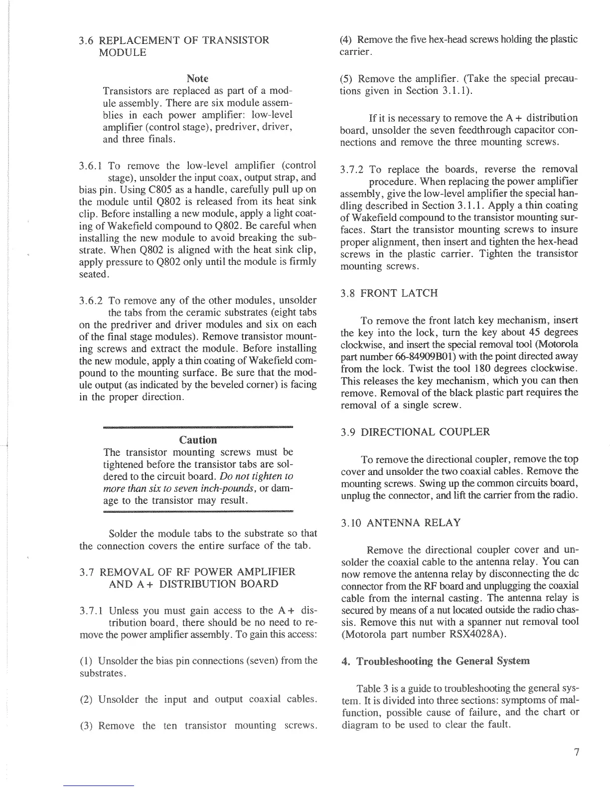 Motorola SYNTOR X - Component Replacement and Troubleshooting; Transistor Module Replacement; Power Amplifier and Distribution Board Removal; Front Latch and Directional Coupler Removal