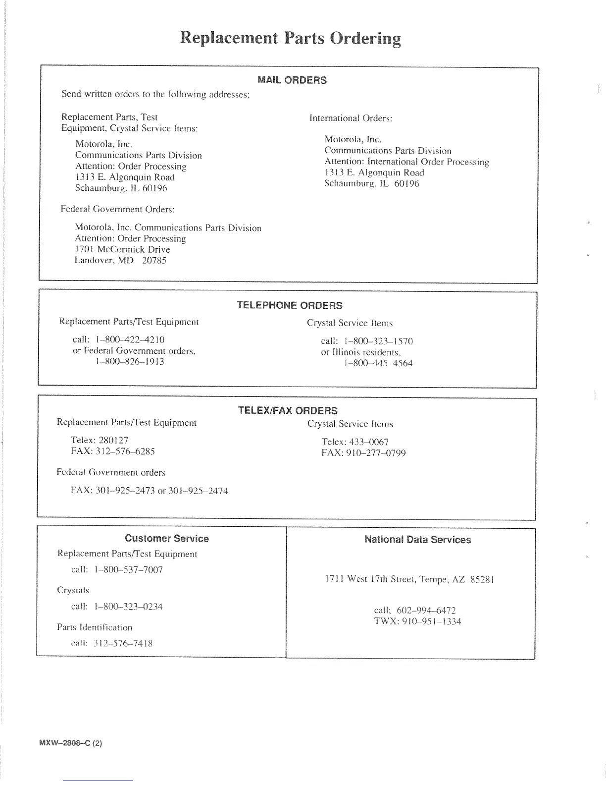 Motorola SYNTOR X - Replacement Parts Ordering Information; Mail Order Addresses; Telephone Order Contacts; Telex;Fax Order Contacts