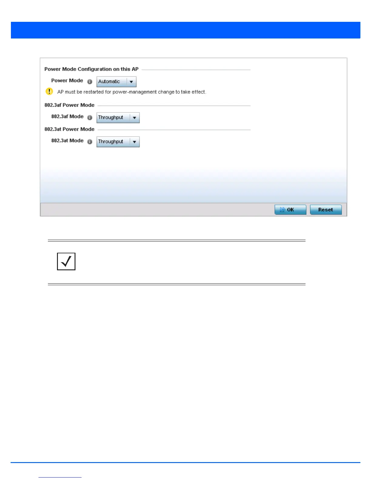 7. Select OK to save the changes made to the access point power configuration. Select Reset to revert to the last saved
