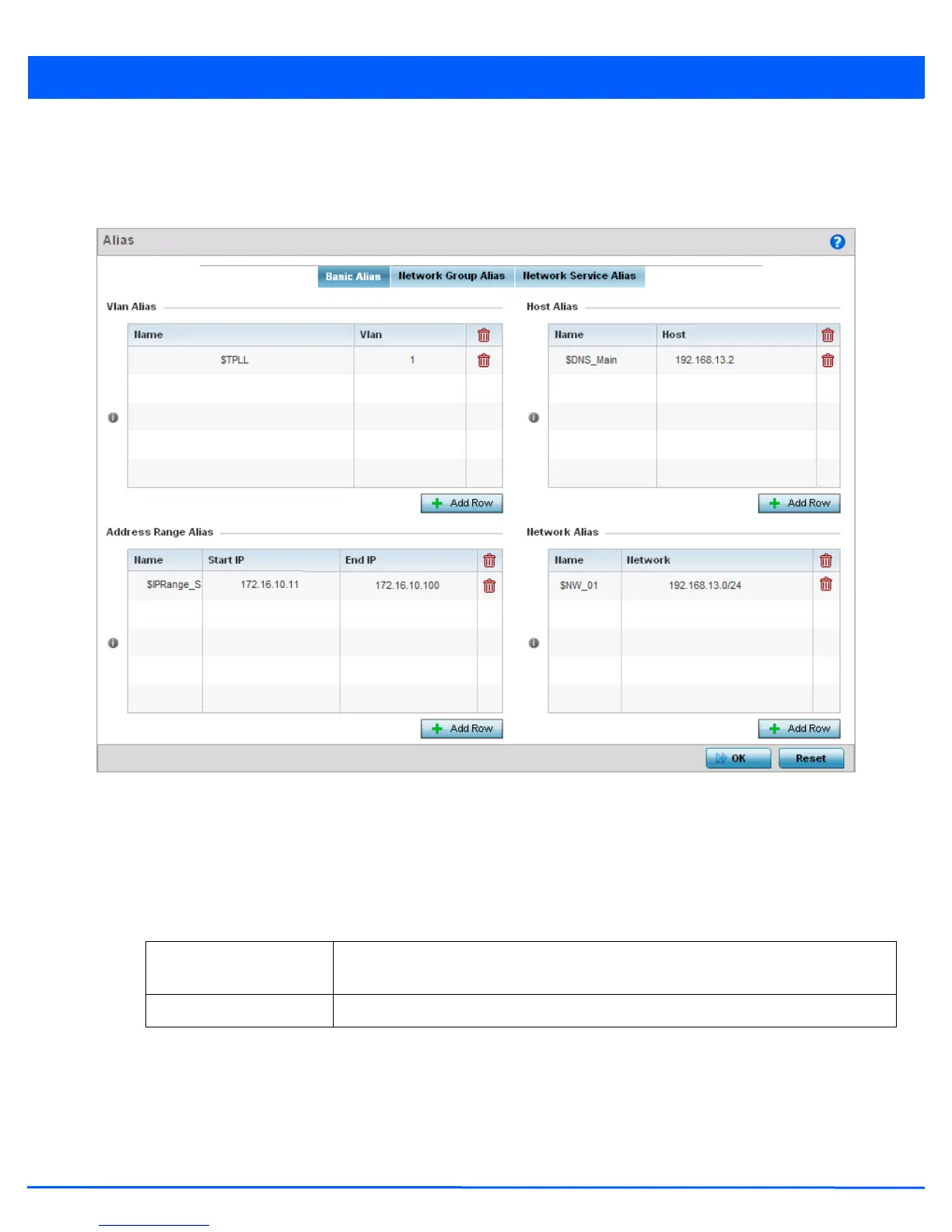 5. Select + Add Row to define VLAN Alias settings: