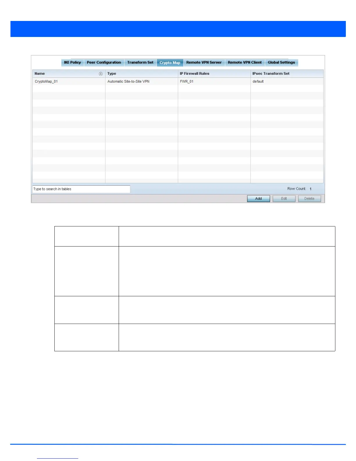 22. If requiring a new crypto map configuration, select the Add button. If updating the configuration of an existing crypto map,