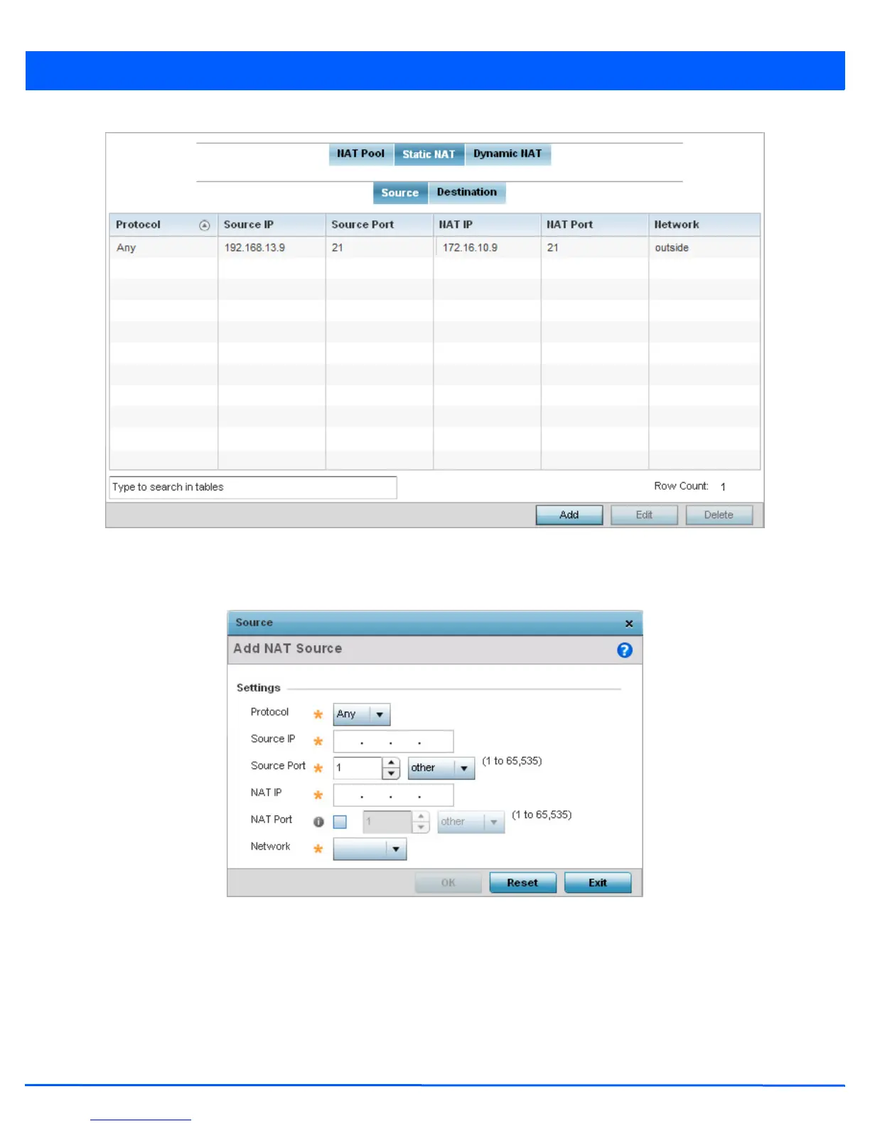 10. To map a source IP address from an internal network to a NAT IP address click the Add button. The following screen