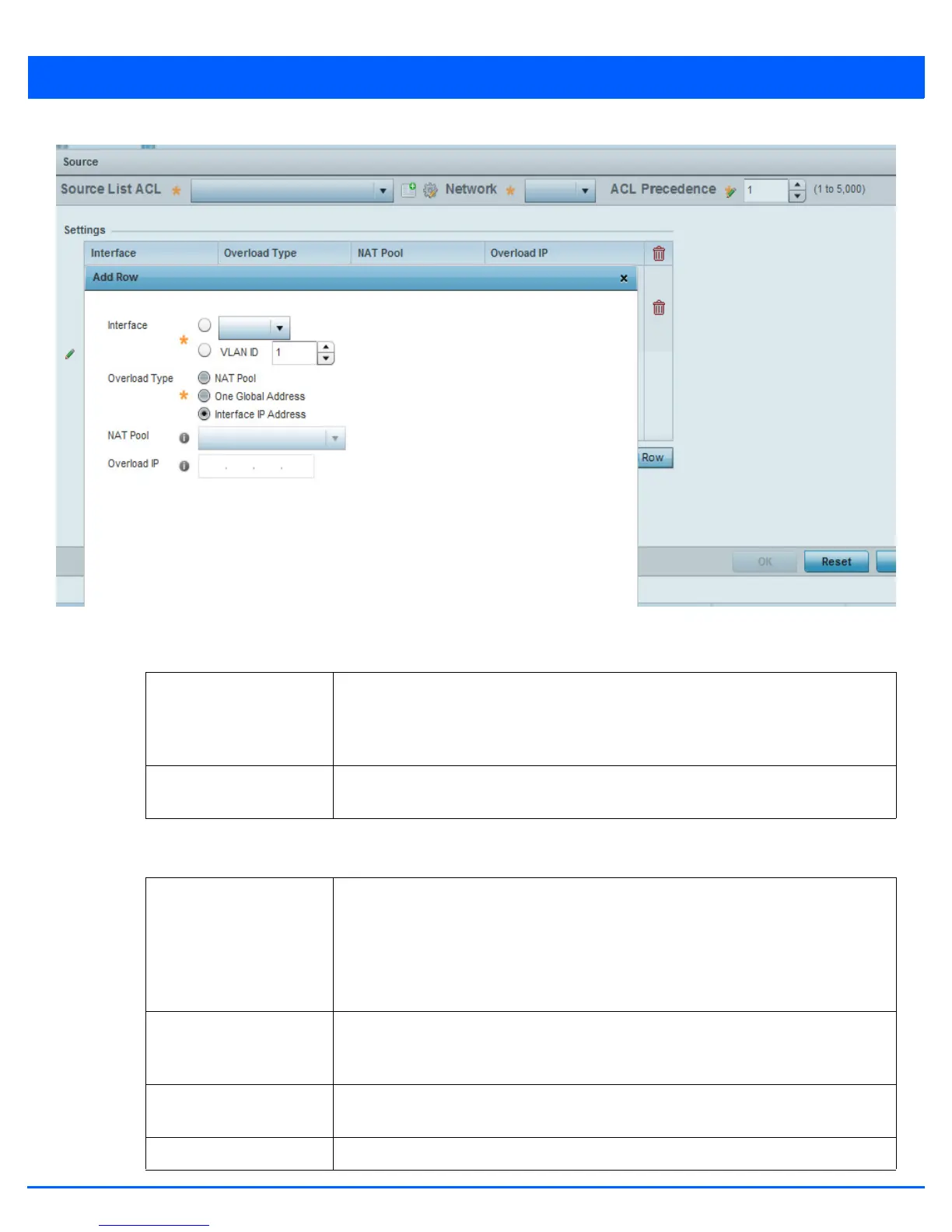 20. Select + Add Row to launch a pop up screen used to define the Interface, Overload Type, Nat Pool and Overload IP