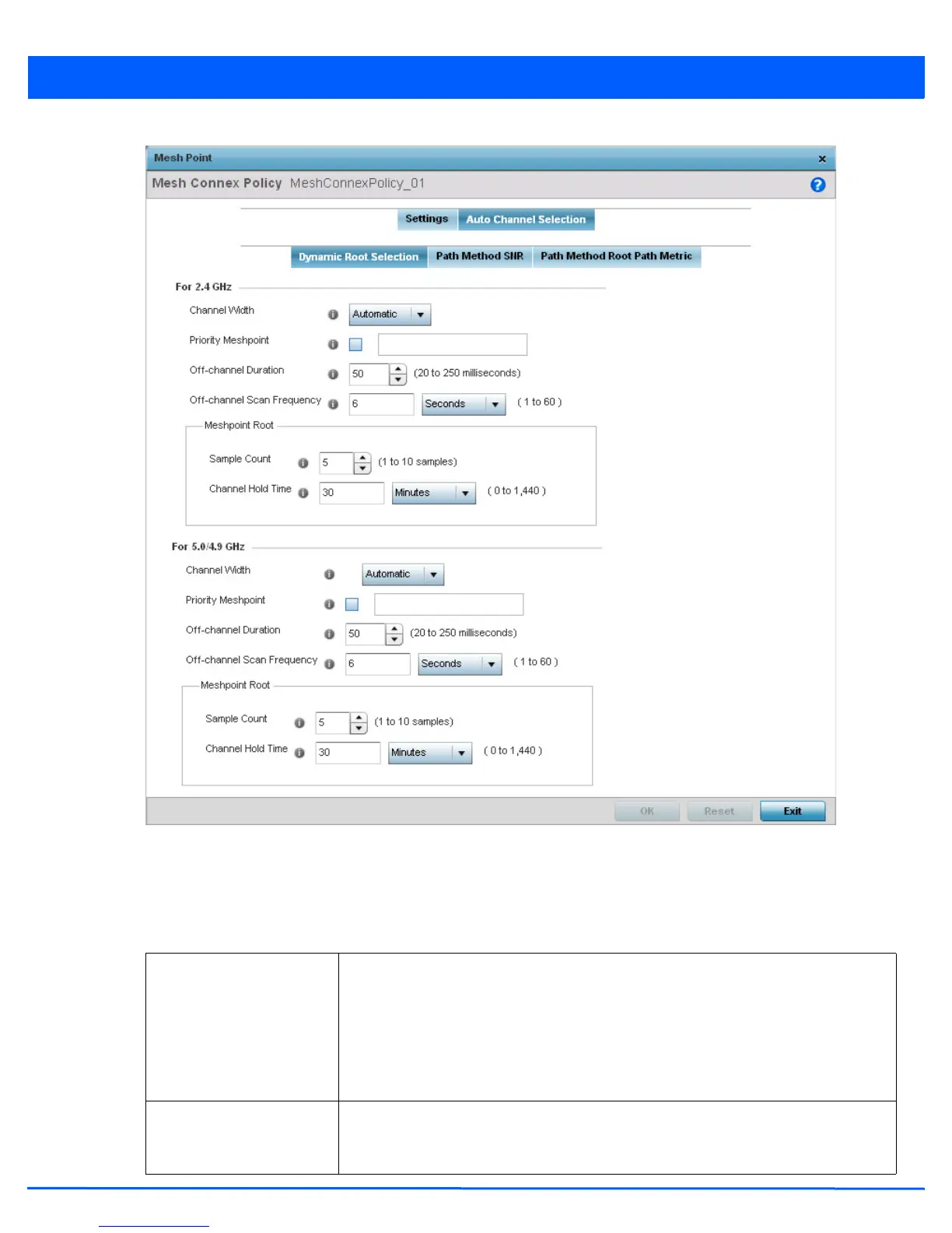 on the Auto Channel Selection Dynamic Root Selection screen. These descriptions are common for configuring the 2.4 GHZ