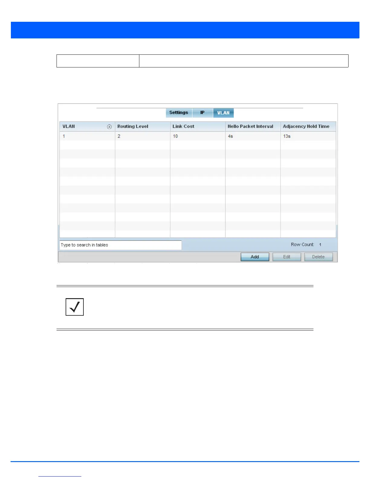 The VLAN tab displays the VLAN, Routing Level, Link Cost, Hello Packet Interval and Adjacency Hold Time managed devices