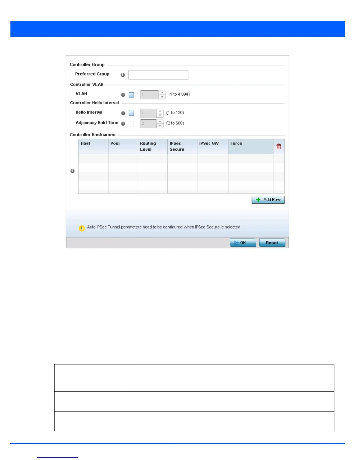11. Use the + Add Row button to populate the Controller Hostnames table with the following host, pool and routing