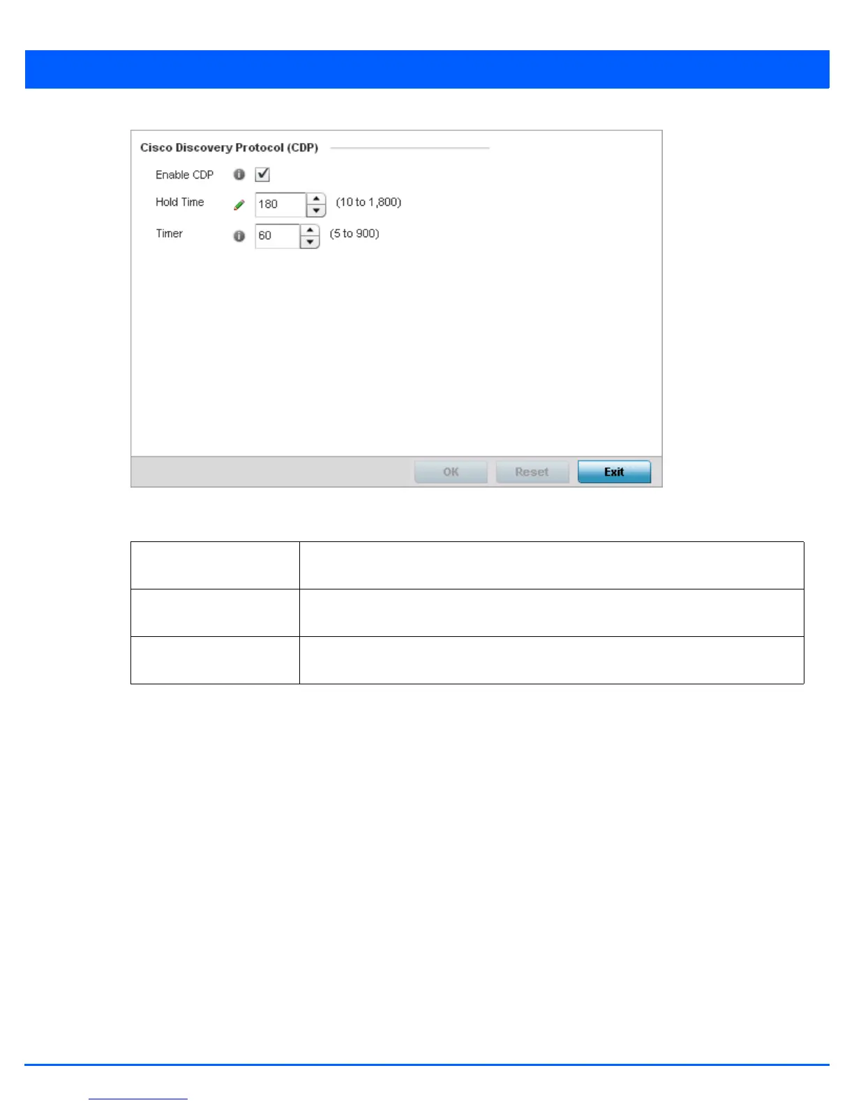 Hold Time Set a hold time (in seconds) for the transmission of CDP packets. Set a value from 10 -