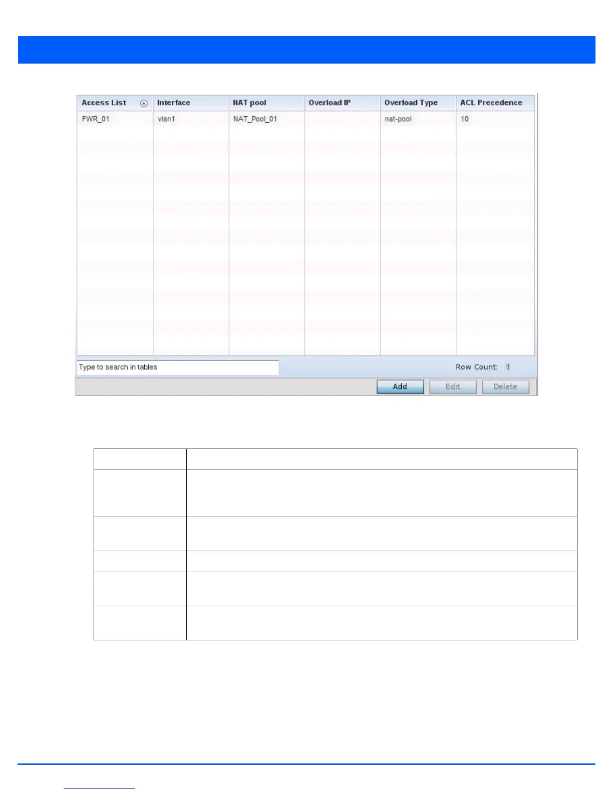 Overload Type Lists the overload type used with the listed IP ACL rule. Set as either NAT Pool, One Global