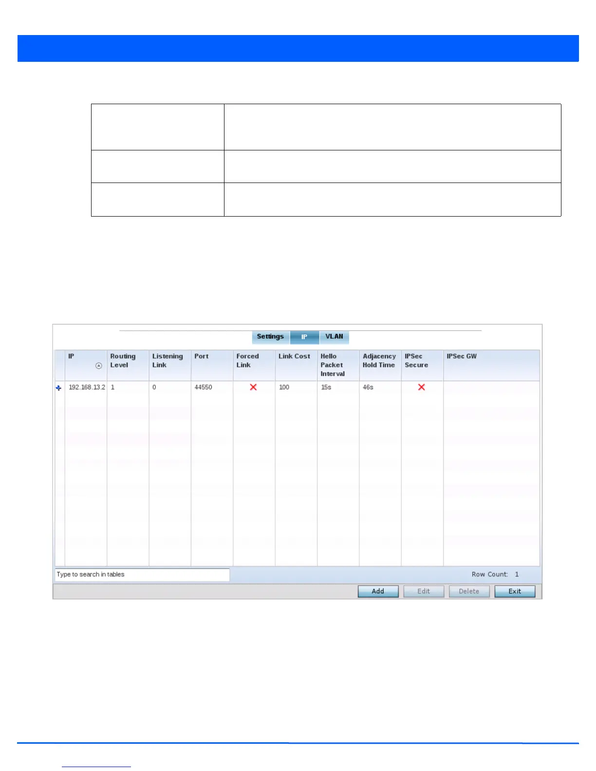 The IP tab displays the IP address, Routing Level, Listening Link, Port, Forced Link, Link Cost, Hello Packet Interval and
