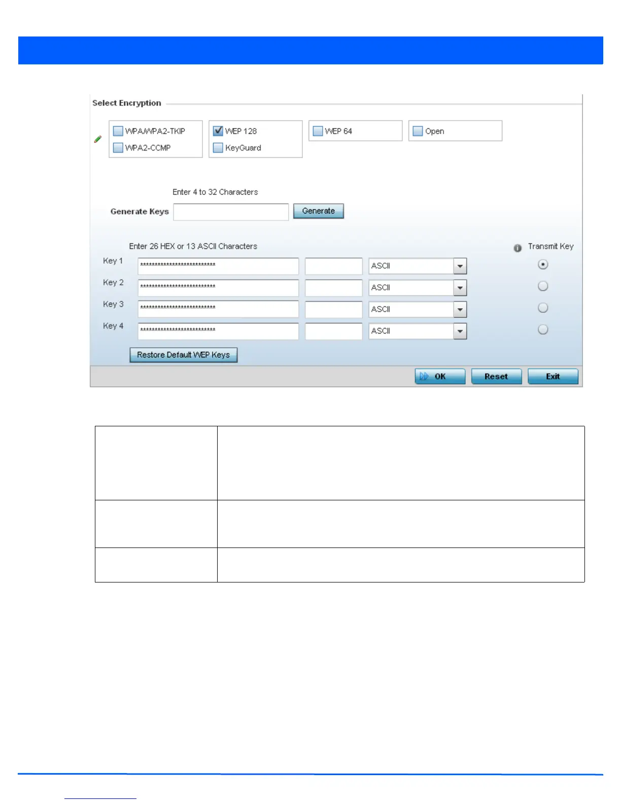 8. Select OK when completed to update the WLAN’s WEP 128 encryption configuration. Select Reset to revert the screen