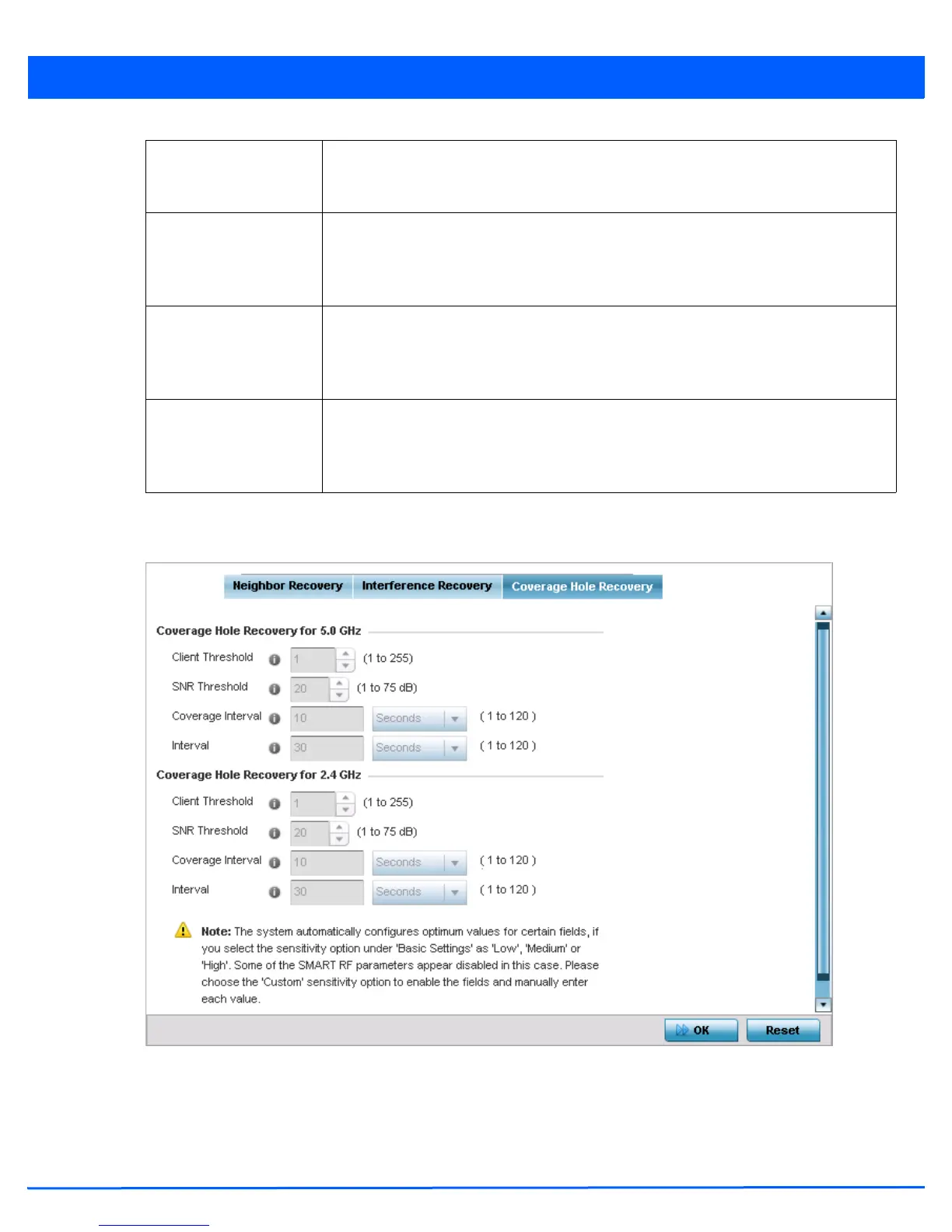 26. Select OK to update the Smart RF Interference Recovery settings. Select Reset to revert to the last saved configuration.
