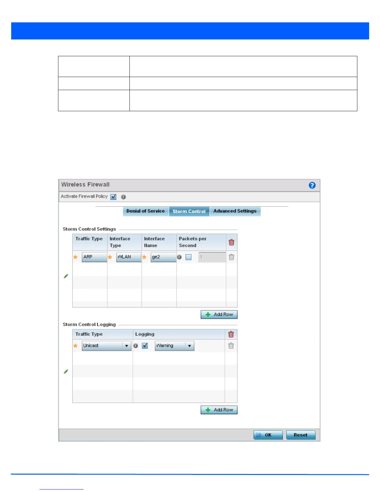 7. Select the Storm Control tab. Select the Activate Firewall Policy option on the upper left-hand side of the screen to