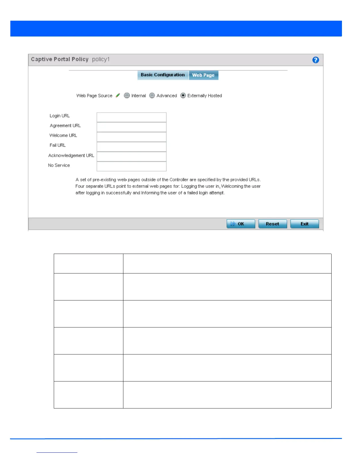 Figure 9-5 Captive Portal Policy screen - Web Page tab - Externally Hosted Web Page screen