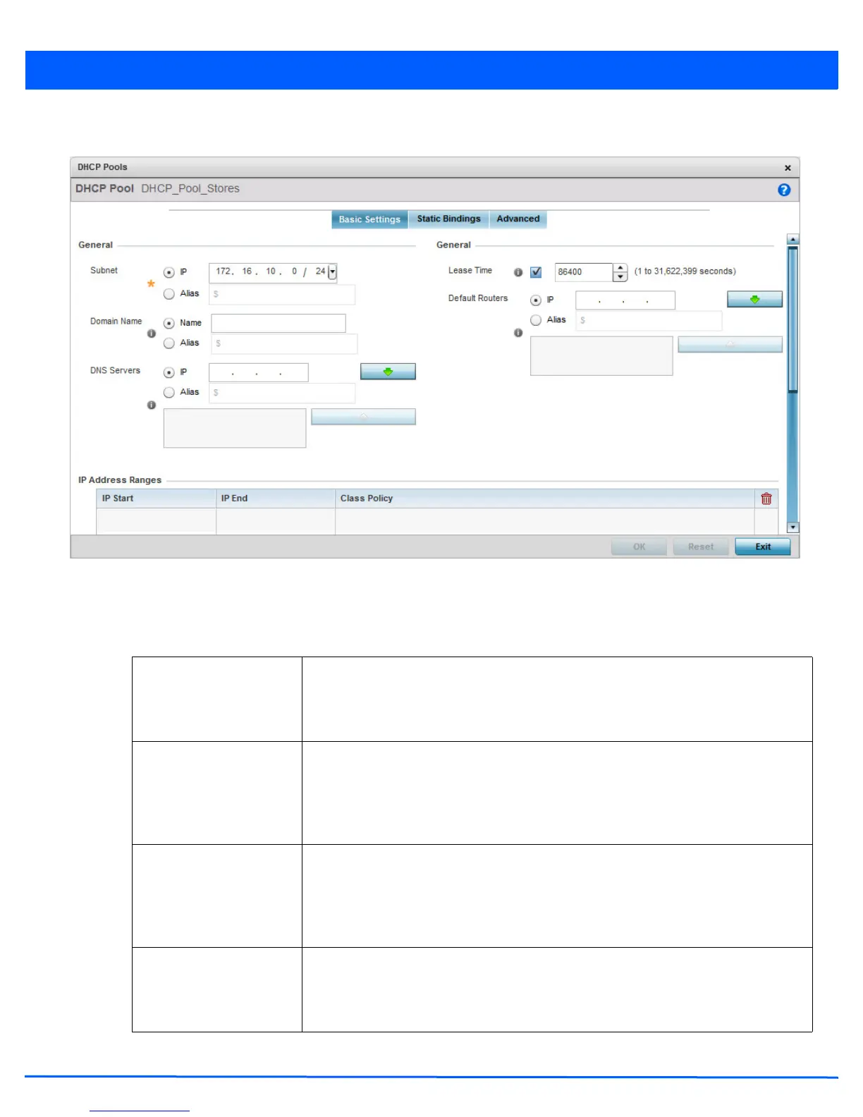 If adding or editing a DHCP pool, the DHCP Pool screen displays the Basic Settings tab by default. Define the required