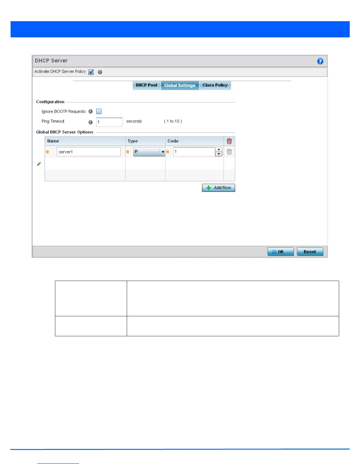 4. Select OK to save the updates to the DHCP server global settings. Select Reset to revert to the last saved configuration.