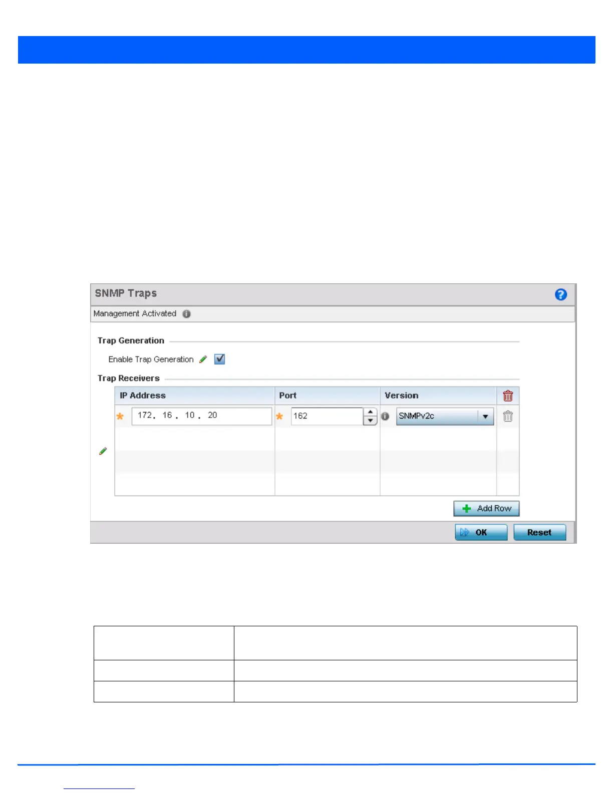 5. Select OK to update the SNMP Trap configuration. Select Reset to revert to the last saved configuration.
