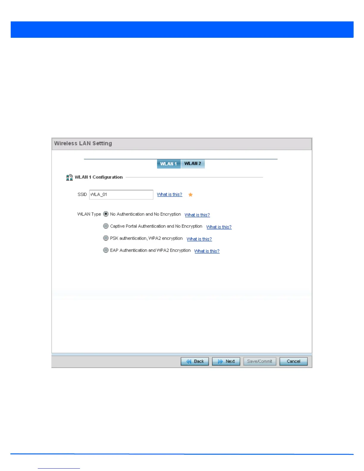 Use the Wireless LAN Setup screen to configure the WLAN parameters. Up to two (2) WLANs can be configured for the access